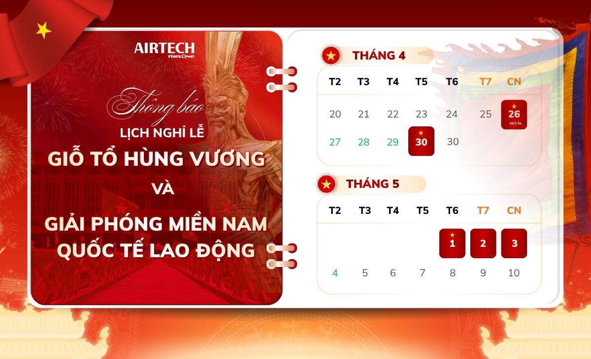 Hòa chung không khí hân hoan chào mừng các ngày đại lễ lớn của dân tộc, Công ty Cổ phần Airtech Thế Long xin trân trọng thông báo lịch nghỉ lễ Giỗ Tổ Hùng Vương và 30/4 – 1/5 năm 2026 như sau: